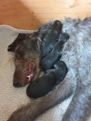 Somehow it all went very fast. In the evening of Thursday our Froineach got her depressions, on Sunday evening she got the opening conttactions, early morning of the 11th December 2023 she lost the mucous plug and 30 minutes later the first puppy boy was born. Within 70 minutes another four puppies followed and then number six. After that she made a break of a bit more than one hour. After the break another six puppies were born, so six boys and six girls within nine hours, that was the turbo gear.